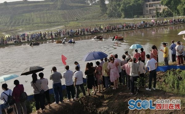 6月24日早上8点半左右,土桥村庆端午节活动现场,挤满了前来参加活动的村民,伴随着隆隆鼓声,“怪模怪样”划舟比赛正式开始。来自土桥村各组的村民以组为单位,选出两名代表,以木盆为舟,从农田的一端划至另一端后返回,用时最少的一组获胜。只见参赛选手们有的撑杆“划舟”,有的直接跳入水中,推着“木舟”前行,现场气氛活跃,欢呼呐喊声此起彼伏。