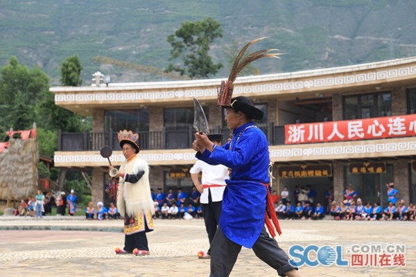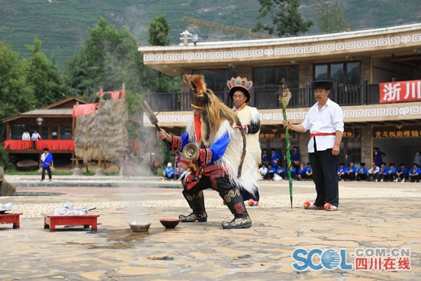 四川在线消息(记者 徐中成 周琳/视频)6月25日,在茂县中国古羌城,5名当地羌族释比来到活动现场,表演起了舔铁铲、踩铧头、抓白石等绝技。