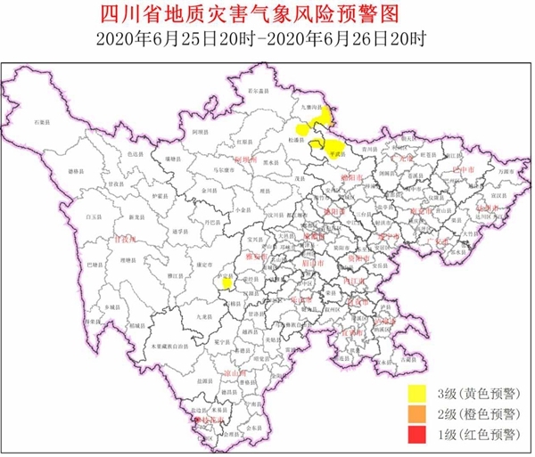 四川在线消息(记者 寇敏芳)6月25日,省地质灾害指挥部办公室发布全省地质灾害气象风险预警。结合四川省气象台天气预报情况,6月25日20时~6月26日20时,绵阳平武县,阿坝州松潘县、九寨沟县,甘孜州泸定县,地质灾害气象风险等级为3级(黄色预警)。