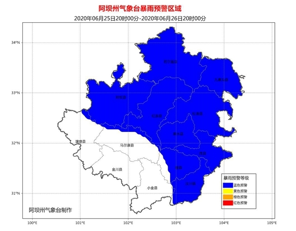 四川在线消息(记者 徐登林)6月25日下午,阿坝州气象台发布暴雨蓝色预警、小流域山洪气象风险预警和地质灾害气象风险预警。