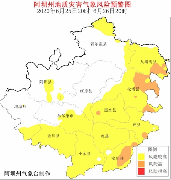 根据气象资料分析,25日20时-26日20时,阿坝州13个县(市)发生地质灾害气象风险等级较高,其中汶川县、茂县、松潘县、九寨沟县、黑水县的部分地方发生地质灾害气象风险等级高,请注意预防。