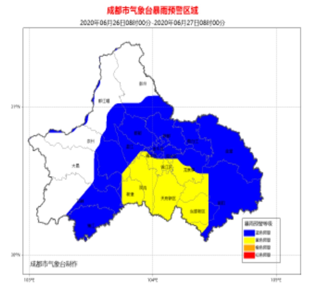 四川在线消息(记者 陈婷)成都市气象台今天早上刚刚发布暴雨蓝色预警:受西南低涡影响,预计成都市6月26日8时到27日8时有一次明显的雷雨天气过程,雨量大雨到暴雨,其中主城区、高新南区、龙泉驿、东部新区、简阳、金堂、双流、新津、天府新区的局部地方可达100毫米以上,雷雨时伴有短时阵性大风。请各地注意防范雷电、大风、短时强降水等灾害天气带来的不利影响。