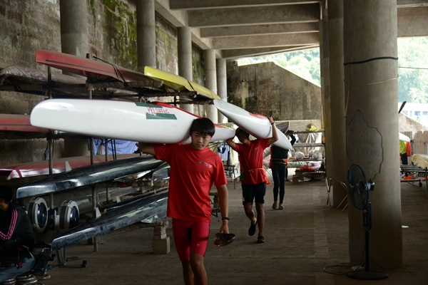 40分钟水上训练结束,队员们从头到脚湿了个遍。“分不清到底是汗水还是江水打湿了全身。”曹智慧说,因为烈日下的高强度训练,再加上浆击打水面溅起的水花,每场水上训练下来,全身都会湿透。