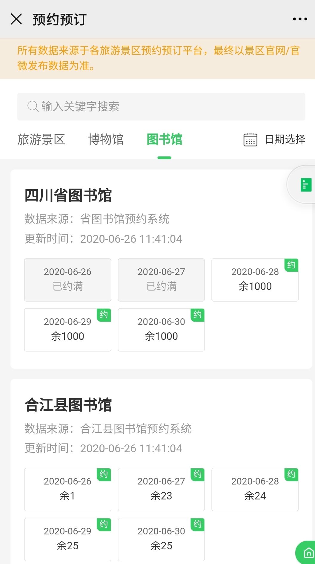 四川在线消息(记者 边钰)端午假期,越来越多的川人选择走进图书馆,在书香中寻求心灵的诗与远方。6月26日,记者从四川省文旅厅“智游天府”预约平台获悉,继端午假期第一天,四川省图书馆(下简称“省图”)迎来入馆人数1000人的限制高峰后,截至今天中午12时,省图6月26日、27日网络预约已达到疫情防控期间的每日最大限量1000人次。这两日未预约到的读者可选择其他区县图书馆借阅,或调整行程,错峰来馆。