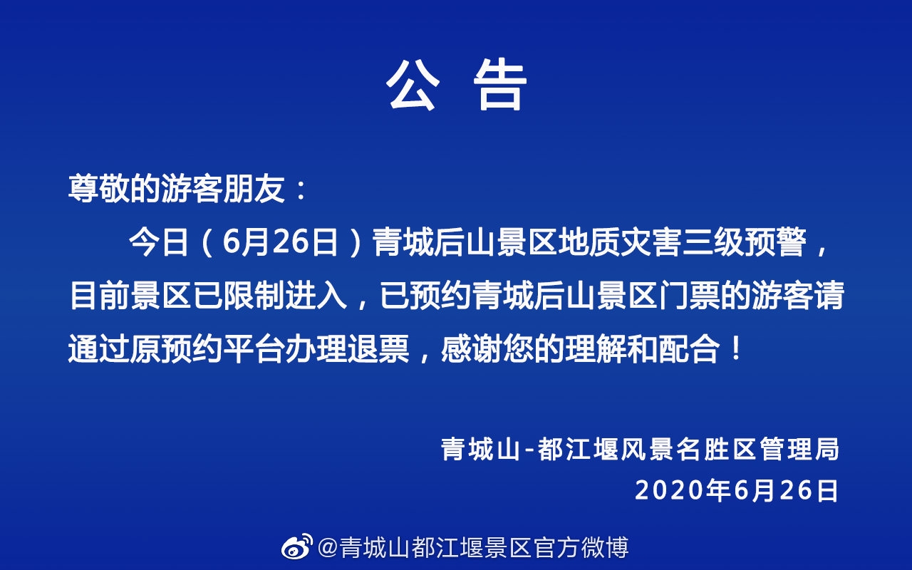 四川在线消息(郭静雯)记者从都江堰青城山景区管理局获悉,截至6月26日14时,都江堰景区游客量7103人,在园游客1817人。青城前山景区景区游客量2639人,在园游客898人。青城后山景区因地质灾害3级预警,目前后山景区已实行交通管制,请勿前往。
