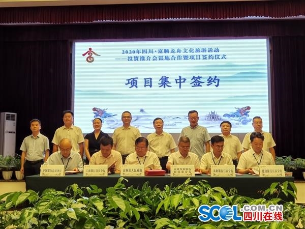 四川在线消息(记者 秦勇 文/图)6月25日,在2020四川.富顺龙舟文化旅游活动—投资推介银地合作暨项目签约仪式上,自贡富顺县与5家银行签署重大项目融资合作协议,与中石油天然气股份有限公司四川销售分公司、四川省环保产业协会等企业签署13个项目投资合作协议,涉及文旅、新基建等领域,总投资22.6亿元。