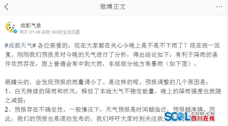 明天(6月28日)白天,盆地西北部以阴天间多云天气为主,其余地方阴天间多云有分散的阵雨或小雨;川西高原和攀西地区阴天间多云有雷雨或阵雨,雨量普遍小到中雨,其中凉山州东北部局部地方有大雨。