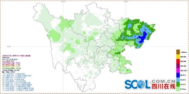 6月26日20时至27日08时,强降雨主要出现在南充、广安、达州、遂宁、资阳、内江、自贡、宜宾、泸州8市和凉山州东北部,暴雨294站,大暴雨40站,排名前三的降水量出现在凉山冕宁180.1mm、宜宾长宁166.1mm,泸州合江147.7mm。