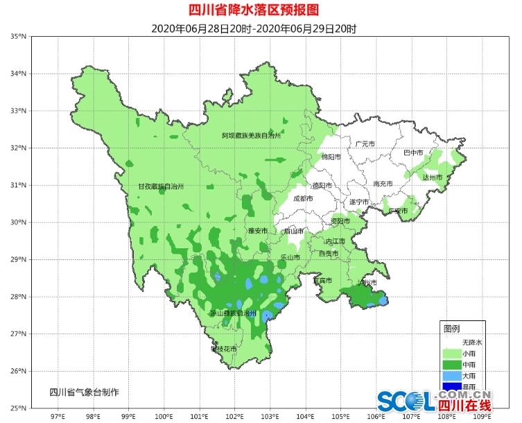 6月28日晚上到29日白天,雅安、乐山、宜宾、泸州、自贡、内江、资阳、广安、达州9市和西部沿山阴天间多云有阵雨或小雨,其中泸州南部有中雨,盆地其余地方多云;川西高原和攀西地区阴天间多云有雷雨或阵雨,雨量普遍小到中雨,其中凉山州局部地方有大雨。