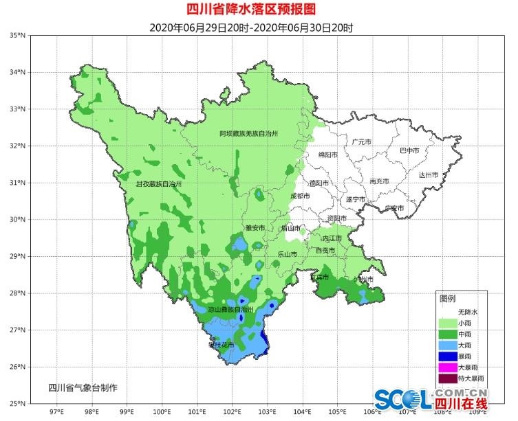 6月29日晚上到30日白天,盆地大部地方多云,其中雅安、乐山、宜宾、泸州、自贡、内江6市大部及西部区沿山多云间阴有阵雨,宜宾、泸州、雅安3市南部有中到大雨;川西高原阴天间多云有雷雨或阵雨,雨量小到中雨,攀西地区大部阴天有中到大雨,局部暴雨。