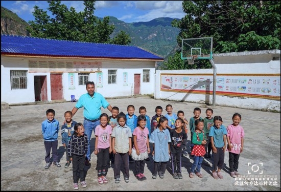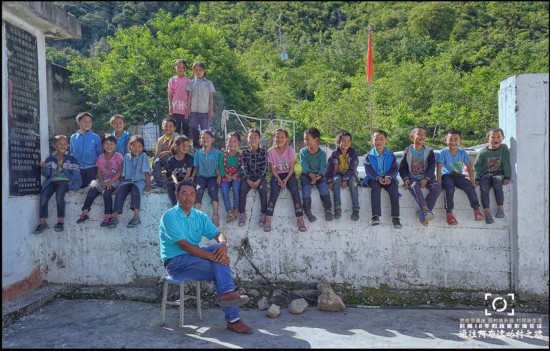 ● 阿布洛哈小学校长拖觉色子和二级年小学生在旧校舍。拍摄于2020年6月24日