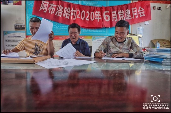 ● 吉列子日(右一)成为村里第一个大专生。2017年3月,22岁的吉列子日成为阿布洛哈村第二任村支书,也是布拖县最年轻的村支部书记。他带领村里的党员和群众,围绕脱贫目标制定规划做实扶贫产业。拍摄于2020年6月20日。