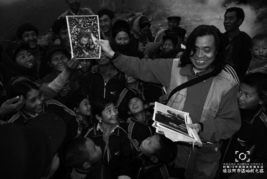 ● 四川著名摄影师林强将他拍摄的照片分发给阿布洛哈村的村民。摄于2007年7月