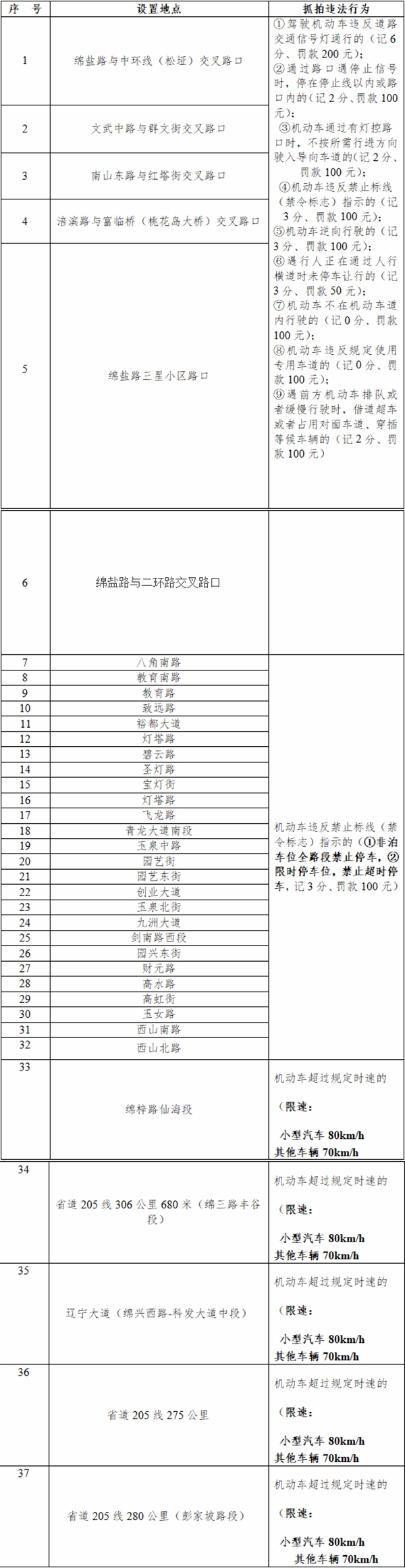 6月28日,记者从绵阳市公安局交通警察支队了解到,从2020年7月1日零时起,绵阳市将启用37处固定交通监控技术设备,对违法停车、不礼让行人违反禁令标志、标线指示等交通违法行为进行抓拍取证并处罚。
