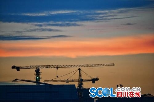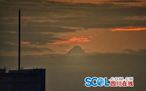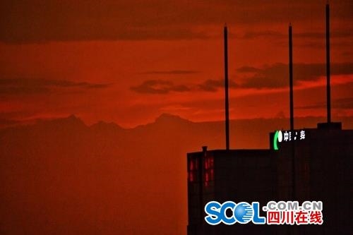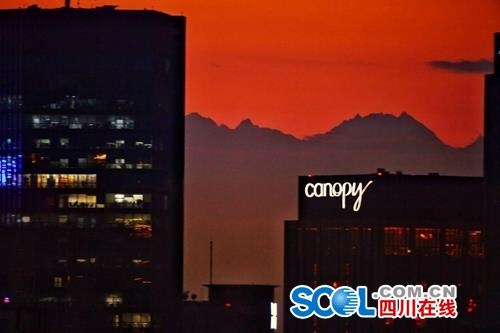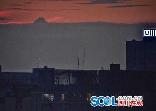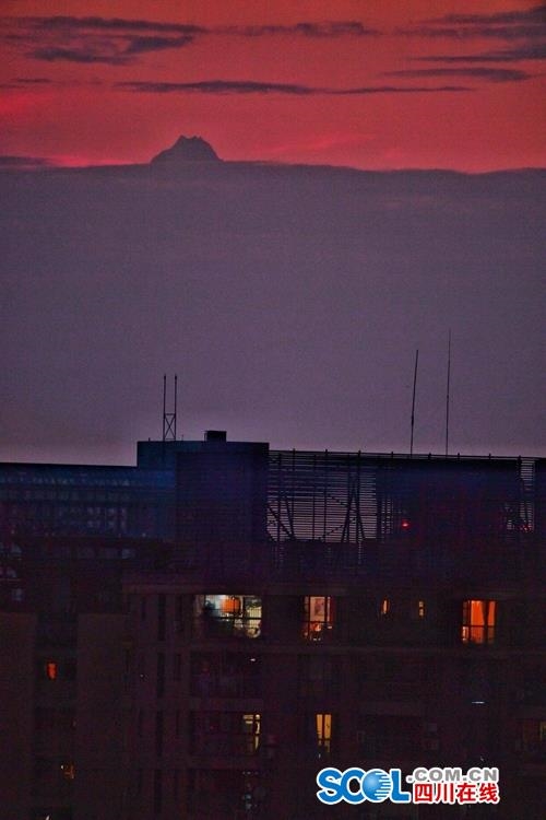 四川在线消息(记者何海洋摄)6月28日,傍晚时分晚霞出现在成都市区西面,随着太阳西沉,在光线的照耀下,西边的群山逐渐显现,四姑娘山的幺妹峰峰顶也开始出现,在距离100多公里外的城区能清晰见到。