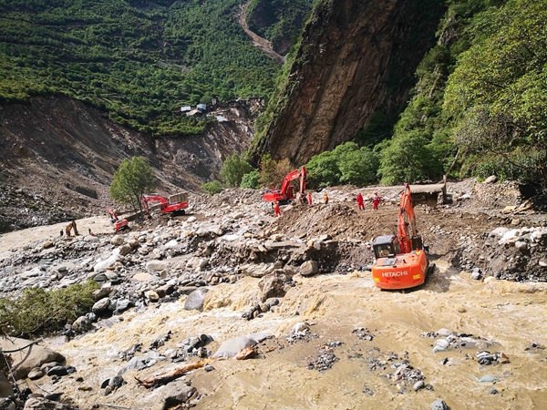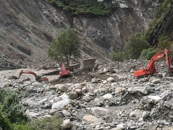 在此之前,从6月19日起,丹巴县“6•17”山洪泥石流灾害抢险救灾前线指挥部利用小金县支援的5台小型挖掘机,已通过疏通河槽对阿娘寨滑坡体下方河流进行了人工干预,并取得了初步成效。