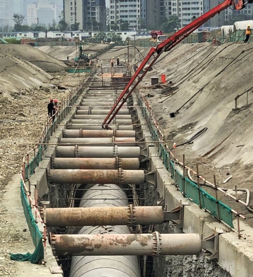 成都金融总部商务区三期截污干管工程是成都市锦江水生态治理的重点工程,管线北起锦江大道,南至锦悦东路,总长度约1.9千米,内径达2.6米,每节管道长2米,重达11吨,体型巨大,在成都主城区较为少见,是名副其实的“地下长龙”。项目建成后可以解决成都市主城区排水管道运行压力,避免主城区暴雨天气道路雨污水外溢的情况,同时对保护成都母亲河、助力打造成都美丽宜居公园城市具有重要的积极意义。