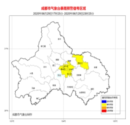 截至6月29日17时40分,四川有三座城市发布暴雨预警: