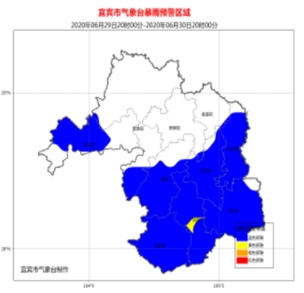 宜宾市气象台预计,6月29日20时到6月30日20时,筠连县、高县、兴文县、珙县、江安县、长宁县以及叙州区、屏山县的局部地方雨量可达50毫米。