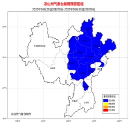 凉山州气象台预计,6月29日20时到6月30日20时,凉山州自北向南有一次大雨天气过程,其中西昌市、德昌县、宁南县、普格县、布拖县、金阳县、昭觉县、喜德县、冕宁县、越西县、甘洛县、美姑县、雷波县13县市的局部地区可能出现暴雨。