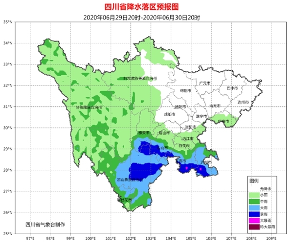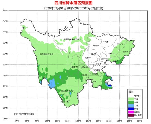 6月30日晚上到7月1日白天,盆地大部阴天有小雨,其中乐山、宜宾、泸州、自贡、内江5市和遂宁北部及南充南部有中到大雨,宜宾、泸州2市的部分地方有暴雨,个别大暴雨;川西高原和攀西地区有阵雨或雷雨,其中甘孜州大部、阿坝州北部及攀西地区南部有中雨,局部大雨,个别暴雨。