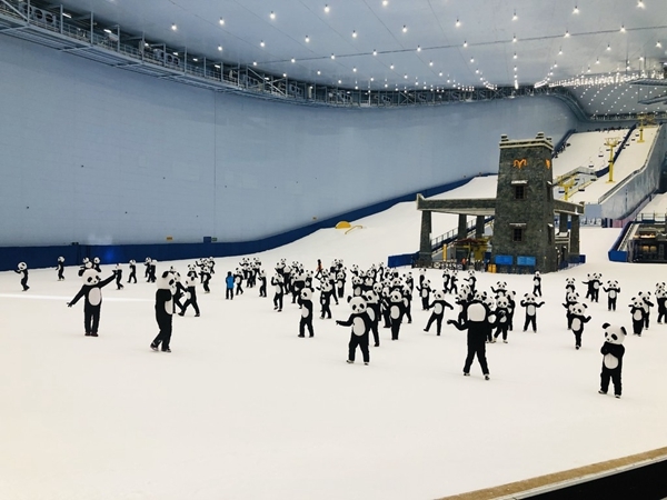 当天开幕式现场,上百只身着熊猫卡通服的“人型滚滚”在雪场里跳起了一场快闪舞,冰天雪地里上演了一场可爱呆萌的冰雪秀。身后的雪道上,数名滑雪表演者摆好队形,在几十米落差的雪道上通过排列不同滑雪阵型,展示出精湛的专业滑雪技术和滑雪运动的魅力。