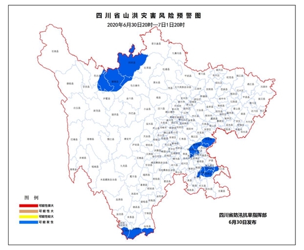 四川在线消息(记者 邵明亮)6月30日,四川省防汛抗旱指挥部发布山洪灾害蓝色预警。