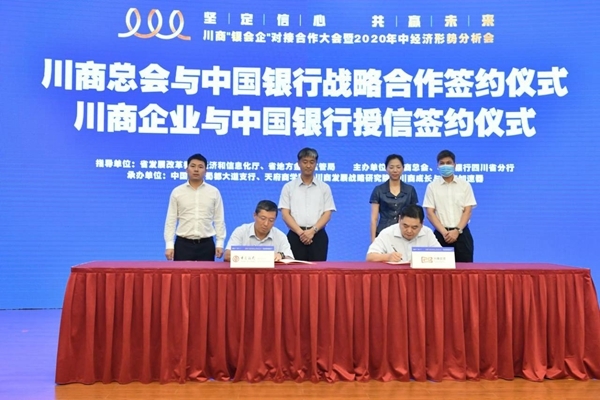6月30日,由川商总会、中国银行四川省分行联合主办的川商“银会企”对接合作大会暨2020年中经济形势分析会在成都举行。会上,川商总会与中国银行签署战略协议,并进行了“中行四川省分行授信川商总会2000亿”的签约,红旗连锁、蓝剑集团、明宇集团等30余家首批企业获融资授信。