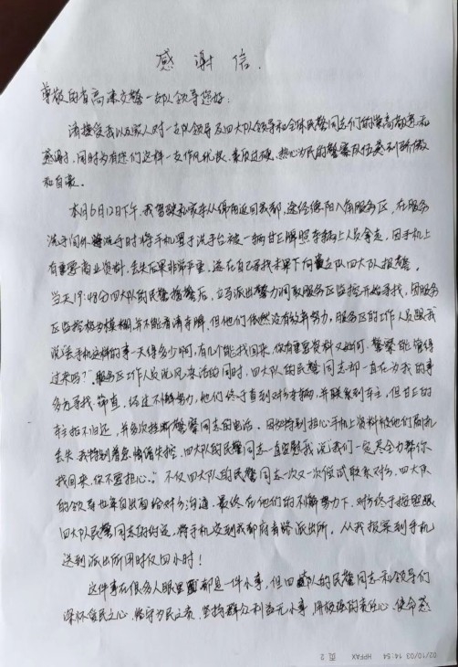 6月20日,四川高速公安一分局四大队收到了一封手写感谢信。余女士在信中对民警帮助其寻回遗失的手机表达了感激之情。