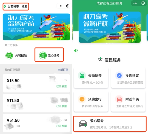 具体怎么预约?该负责人表示,在当前城市定位为成都时,可点击“爱心送考”,输入接送时间、出发地点和考场地址,通过高考出行约车功能进行在线约车。上述负责人表示,预约成功的考生家长会收到客服中心的回访确认电话,确认后将获得7月7号、7月8号两天的接送服务。