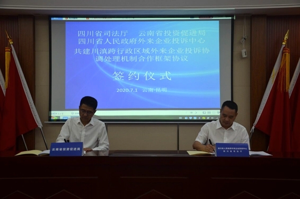 7月1日,省外来企业投诉中心、省司法厅与云南省投资促进局在昆明签署了《积极服务两地良好营商环境共建川滇跨行政区域外来企业投诉协调处理机制合作框架协议书》,川滇两地将共同建立跨行政区域外来企业投诉协调处理机制。
