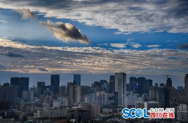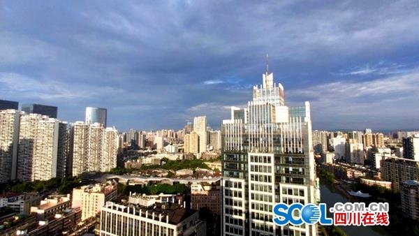 7月1日,雨后成都市区气象万千,朵朵白云在风力的作用下,不停变幻。在光线的作用下,成都变得更加立体。