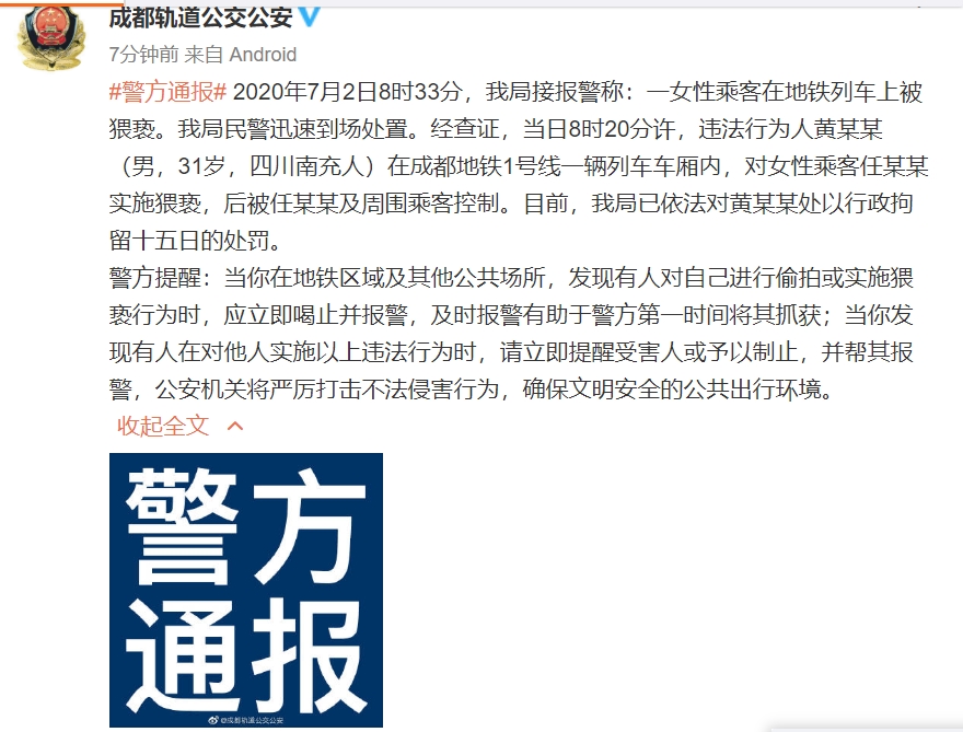 经查证,当日8时20分许,违法行为人黄某某(男,31岁,四川南充人)在成都地铁1号线一辆列车车厢内,对女性乘客任某某实施猥亵,后被任某某及周围乘客控制。目前,成都市轨道公交分局已依法对黄某某处以行政拘留十五日的处罚。