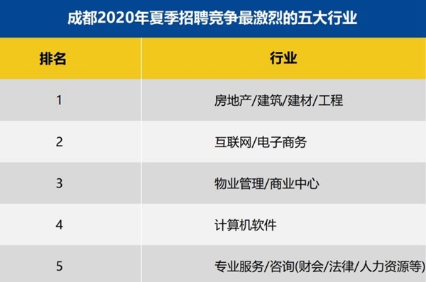 夏季在线数据显示,成都地区竞争指数排名全国38个城市的第十位,竞争指数绝对值环比下降15.2,排名下降八位,竞争指数同比上升3.2。当地排名前五位的行业中,房地产/建筑/建材/工程行业的竞争指数虽然环比、同比出现下降,但是排名依然最高,其次是互联网/电子商务行业,物业管理/商业中心行业排在第三,计算机软件和专业服务/咨询(财会/法律/人力资源等)行业的竞争指数位列第四和第五。竞争指数排名后四位的行业虽然竞争指数环比出现下降,但是同比依然有不同幅度的上升,除了房地产行业和互联网/电子商务行业继续保持在前五的行列中,其他三名都被新的行业取代。