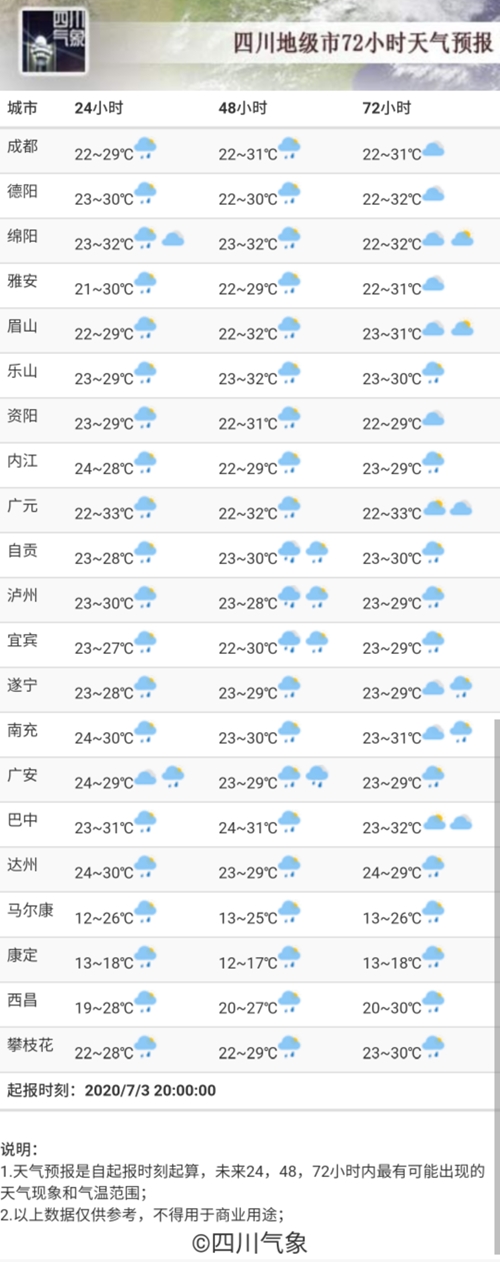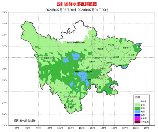 今天(7月3日)晚上,盆地各市阴天,大部地方有阵雨或雷雨,其中达州、雅安、眉山、乐山4市的部分地方有中雨,局部大雨;川西高原北部多云,川西高原其余地方和攀西地区阴天有阵雨或雷雨,局部有中雨。