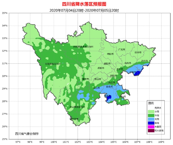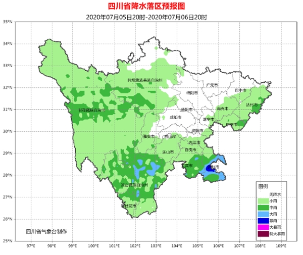 7月4日晚上到5日白天,盆地各市阴天有阵雨或雷雨,其中雅安、乐山、宜宾、泸州、自贡、内江、资阳、遂宁、广安、达州10市的部分地方有中到大雨,局部暴雨;川西高原和攀西地区阴天有阵雨或雷雨,雨量普遍小到中雨,凉山州东北部有大雨。