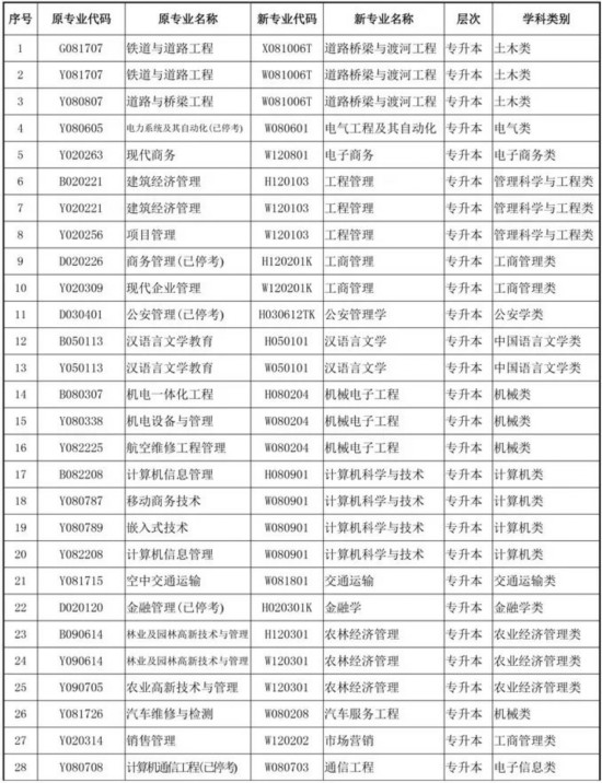 本次调整后,行政管理(专科,乡镇管理方向)等4个专业方向从2020年10月考试起停止新考生报名注册,应用电子技术(专科,电子信息工程方向)等16个专业方向从2021年4月考试起起停止新考生报名注册。