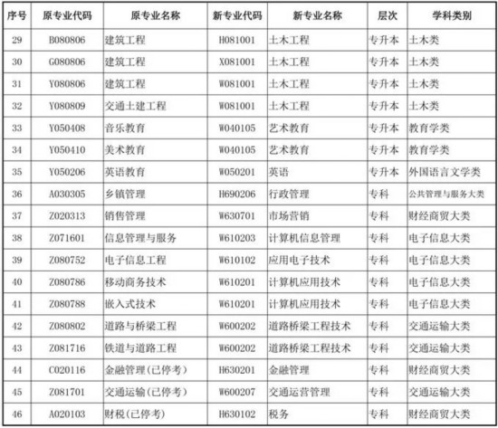 按照教职成厅〔2018〕1号文件要求,进一步推进我省专业名称及代码调整、规范工作,从2021年1月起铁道与道路工程等46个专业按照调整后的专业名称及代码执行。调整后与《普通高等学校本科专业目录(2012年)》《普通高等学校高等职业教育(专科)专业目录(2015年)》《高等学历继续教育补充专业目录》的专业名称和代码、学科分类一致。专业课程设置仍沿用《四川省高等教育自学考试专业考试计划汇编》(2016年版)原专业的相关规定执行。