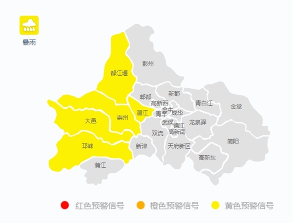 四川在线消息(记者 陈婷)7月3日晚,成都市5个县级气象台分别发布了暴雨黄色预警信号。