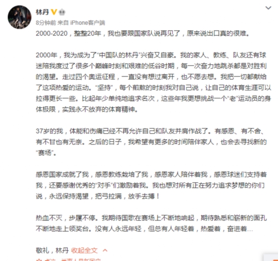 林丹在微博中说:2000-2020,整整20年,我也要跟国家队说再见了,原来说出口真的很难。2000年,我为成为了“中国队的林丹”兴奋又自豪。我的家人、教练、队友还有球迷陪我度过了很多个巅峰时刻和艰难的低谷时期,每一次奋力地跳杀都是对胜利的渴望。走过四个奥运征程,一直没有想过离开,也不愿去想。我把一切都献给了这项热爱的运动。“坚持”,每个煎熬的时刻我对自己说,让自己的体育生涯可以拉得更长一些。比起年少单纯地追求名次,这些年我更想挑战一个“老”运动员的身体极限,实践永不放弃的体育精神。37岁的我,体能和伤痛已经不再允许自己和队友并肩作战了。有感恩、有不舍、有不甘也有无奈。之后的日子,我希望有更多的时间陪伴家人,也会去寻找新的“赛场”。感恩国家成就了我,感恩教练栽培了我,感恩家人陪伴着我,感恩球迷们支持着我,还要感谢优秀的“对手”们激励着我。我也想对所有正在努力追求梦想的你们说,永远保持渴望,把弓拉满,放手去搏!热血不灭,步履不停。我期待国歌在赛场上不断地响起,期待熟悉和崭新的面孔不断地走上领奖台。没有人永远年轻,但总有人年轻着,热爱着,奋进着……