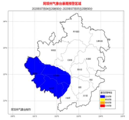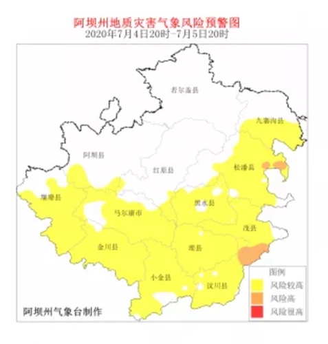阿坝州气象台同时发布了地质灾害气象风险预警:根据气象资料分析,2020年7月4日20时至7月5日20时,汶川县、理县、茂县、松潘县、九寨沟县、金川县、小金县、黑水县、壤塘县、阿坝县、红原县、马尔康市等12县(市)发生地质灾害气象风险等级较高,其中汶川县、茂县、松潘县的部分地方发生地质灾害气象风险等级高。