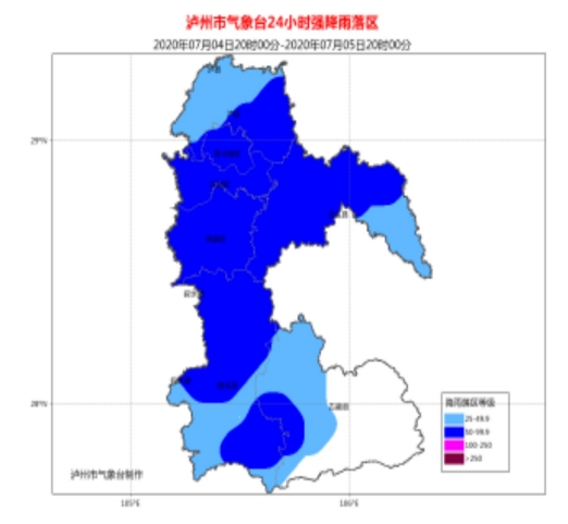 泸州市气象台预计,今晚到明天上午,全市各区县有一次中到大雨天气过程,其中纳溪区、合江县、叙永县部分乡镇以及江阳区、龙马潭区、古蔺县局部地方有暴雨(50~70毫米),局地伴有短时阵性大风、雷电,个别地方有冰雹。请注意防范强降雨天气带来的不利影响。
