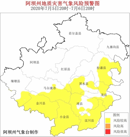 根据气象资料分析,5日20时-6日20时,汶川县、理县、茂县、松潘县、金川县、小金县、黑水县、壤塘县、红原县、马尔康市等10县(市)发生地质灾害气象风险等级较高,请注意预防。