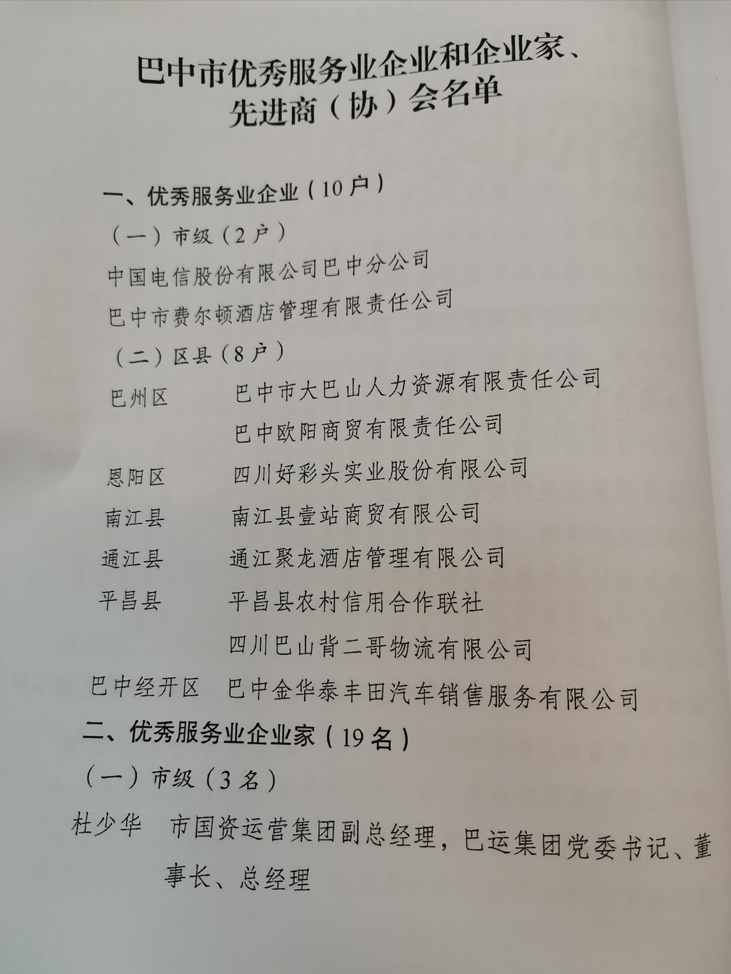 四川在线消息(记者 史晓露)7月6日上午,巴中市召开服务业发展大会,为激励先进,营造服务业发展优良环境,推动全市现代服务业高质量发展,会上对中国电信股份有限公司巴中分公司等10户优秀服务业企业、杜少华等19名优秀服务业企业家、巴中市餐饮行业协会等5个先进商(协)会予以表扬。