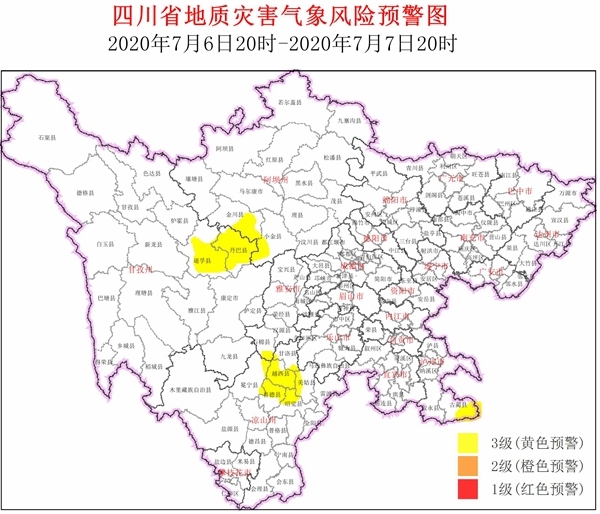 7月6日,省地质灾害指挥部办公室结合四川省气象台天气预报情况,发布全省地质灾害气象风险预警,7月6日20时~7月7日20时,泸州、雅安、阿坝、甘孜、凉山部分地区为3级(黄色预警)。