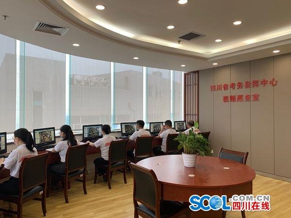 9时过,四川省考务指挥中心视频巡查室内,10台电脑早已开启工作,10名工作人员将在高考各科目考试期间,实时监控全省21市州各高考考场的情况。记者了解到,每一间标准化考场内,都安装了视频监控。工作人员介绍,他们每人负责几个市州的考室网上巡查,随机调取考场监控录像查看,一旦发现问题,将及时上报按规定处理。