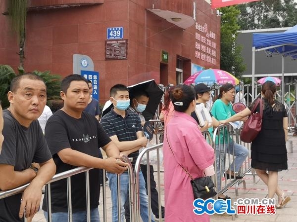 不少家长,送完考生后,等待坐车赶去上班。亦有不少家长不愿离去,守在考点外,等待自己的孩子。