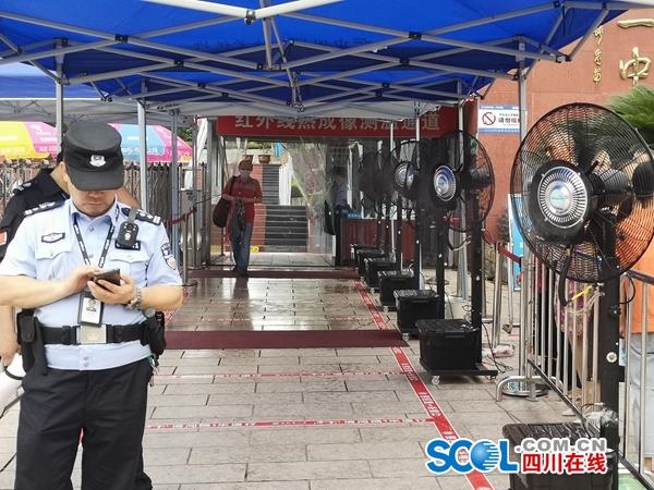 值得注意的是,该考点进口通道,在测温区前端设置一排特别的风扇——水雾(风扇)机。“考生来考点路上,可能走热了,体表温度高。在测体温之前,经过风扇,降低体表温度,让他们不因路途燥热导致体温检测结果异常,也防止因异常影响考生情绪。”该校保卫科科长王强介绍。