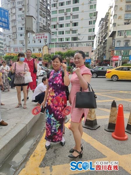 “旗开得胜”,考场外家长穿旗袍为考生加油