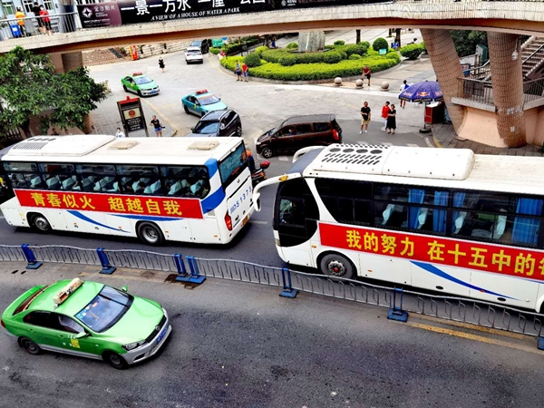 “加油!必胜!”上午8时许,攀枝花东区考区市三中考点外,送考老师为该考点的考生打气。来自攀枝花市十五中的25名送考老师纷纷穿上红衣,助阵高考,“寓意开门红,这是我们对考生最深的祝福。” 攀枝花市十五中送考领队梅静说,专门在考生登上送考车前,用鼓励和拥抱,帮助考生平复紧张的心情。